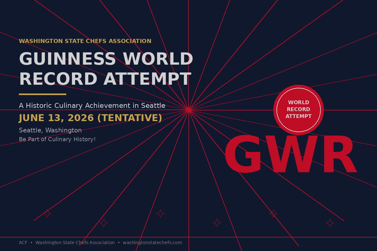 The Washington State Chefs Association is organizing a Guinness Book of World Records attempt in Seattle! Join us on Occidental Ave South for this exciting free public event. Setup begins for a 12 noon start. Come be part of culinary history! Date is tentative - check back for confirmed details.